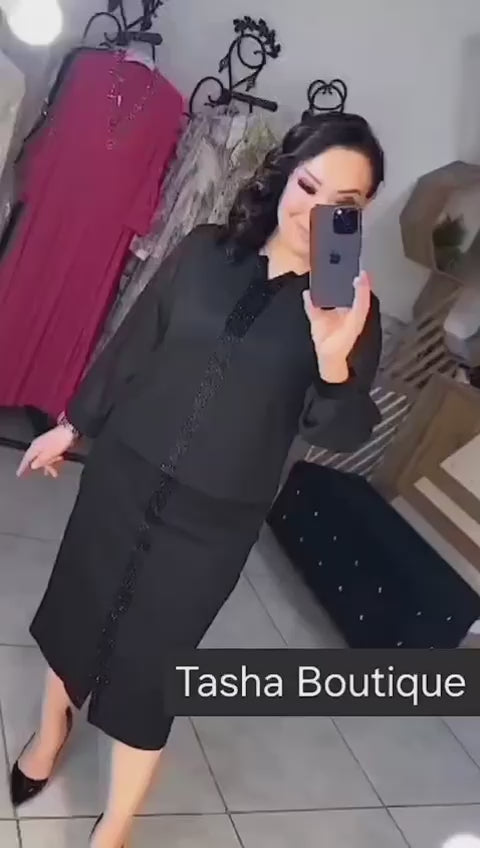 Ez a gyönyörű két részes együttes tökéletes választás, ha igazán elegáns és kifinomult megjelenésre vágysz. A letisztult ceruzaszoknya elegánsan kiemeli az alakot, míg a légies, finom anyagú blúz romantikus részleteivel teszi teljessé az összhatást. A könnyed esésű ujjak és a kontrasztos díszítések különleges bájt kölcsönöznek ennek az összeállításnak.