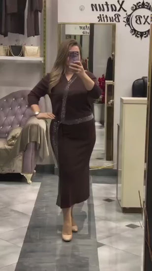 Két részes, elegáns együttes, amely egy bő szabású, midi hosszúságú szoknyából és egy aszimmetrikus dekoltázsú felsőrészből áll. A megjelenést a különleges, csillogó díszítésű öv teszi igazán nőiessé és alkalmi hangulatúvá.