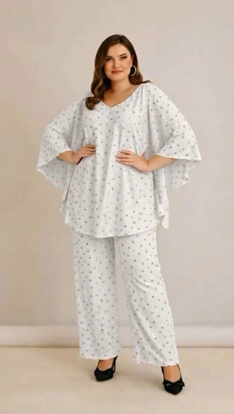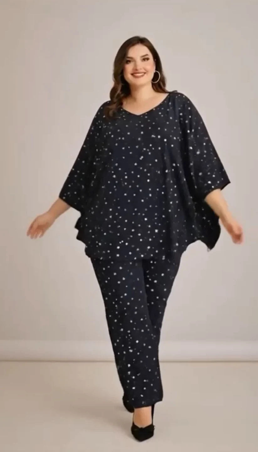 Laza, mégis elegáns összeállítás, amely tökéletes választás a kényelmes és nőies megjelenéshez. A bő szabású, poncsó fazonú felső és a kényelmes nadrág stílusos, mégis könnyed összhatást ad. A visszafogott minta különleges megjelenést kölcsönöz, a puha anyag pedig egész napos komfortot biztosít.