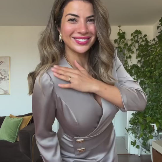 A TSH567 ruha a klasszikus elegancia és a modern nőiesség tökéletes találkozása. Az átlapolt felsőrész karcsúsító hatású, míg a derékrészen elhelyezett aranygombok különleges, luxus megjelenést kölcsönöznek. A selymesen fényes anyag és a térdig érő, lágyan bővülő szabás kiemeli a nőies vonalakat, miközben maximális kényelmet biztosít.