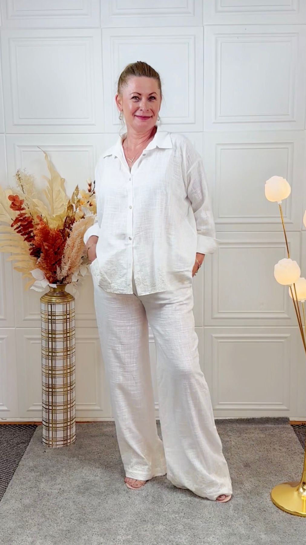 Fedezd fel a TSH552-es kétdarabos együttest – könnyed, széles szárú nadrág és laza, 100% pamutból készült, finom hímzéssel díszített ing. Tökéletes választás a nyári napokra, amikor a stílus mellett a komfort is fontos.