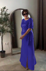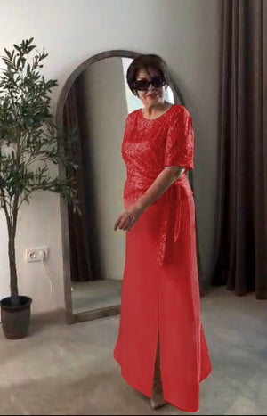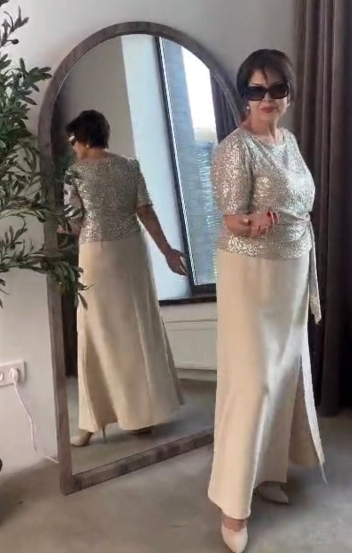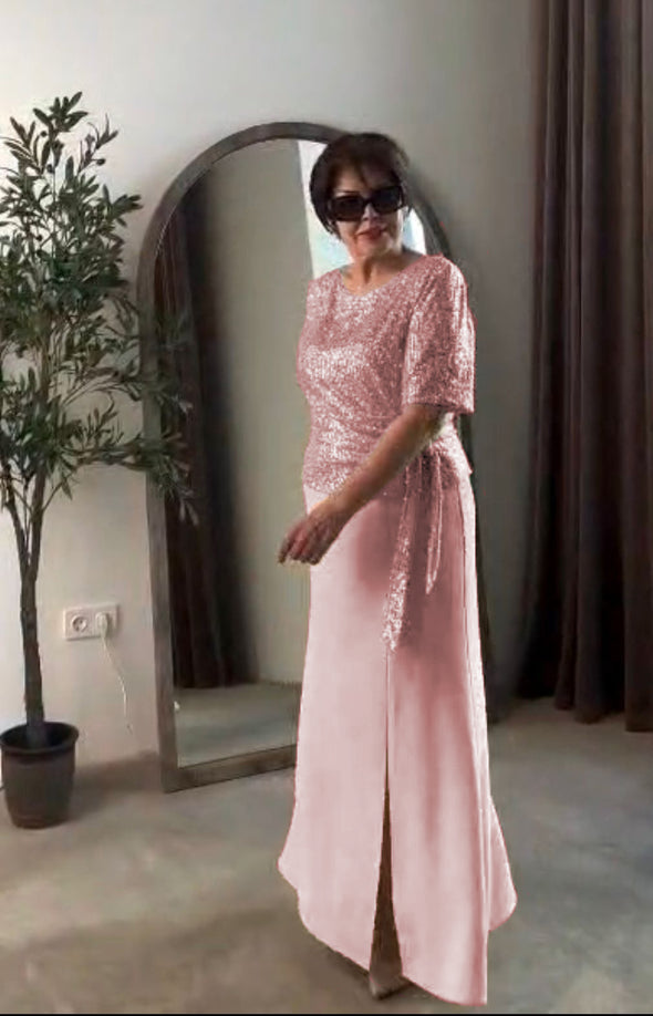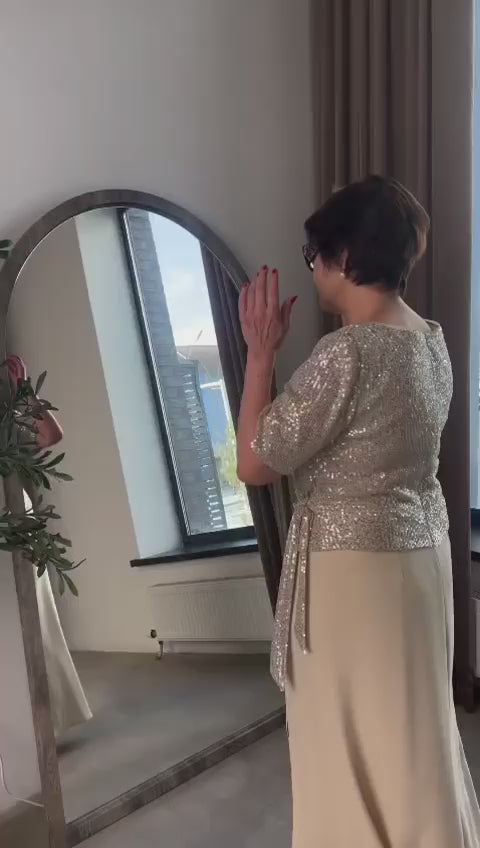 Elegáns, kétrészes szett, értékes flitteres blúz zsinóros résszel , amely a derekát és sellő típusú midiszoknyát jelöli, hasított a lábszárnál.