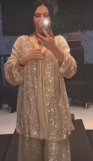 TSH591 Tasha együttes – amikor a kényelem találkozik a látványos eleganciával. A szett könnyed, fluid esésű anyagból készült, amelyet teljes felületén finom flitterek borítanak, így kifinomult, ünnepi csillogást ad minden megjelenésnek anélkül, hogy a komfortból engedne.