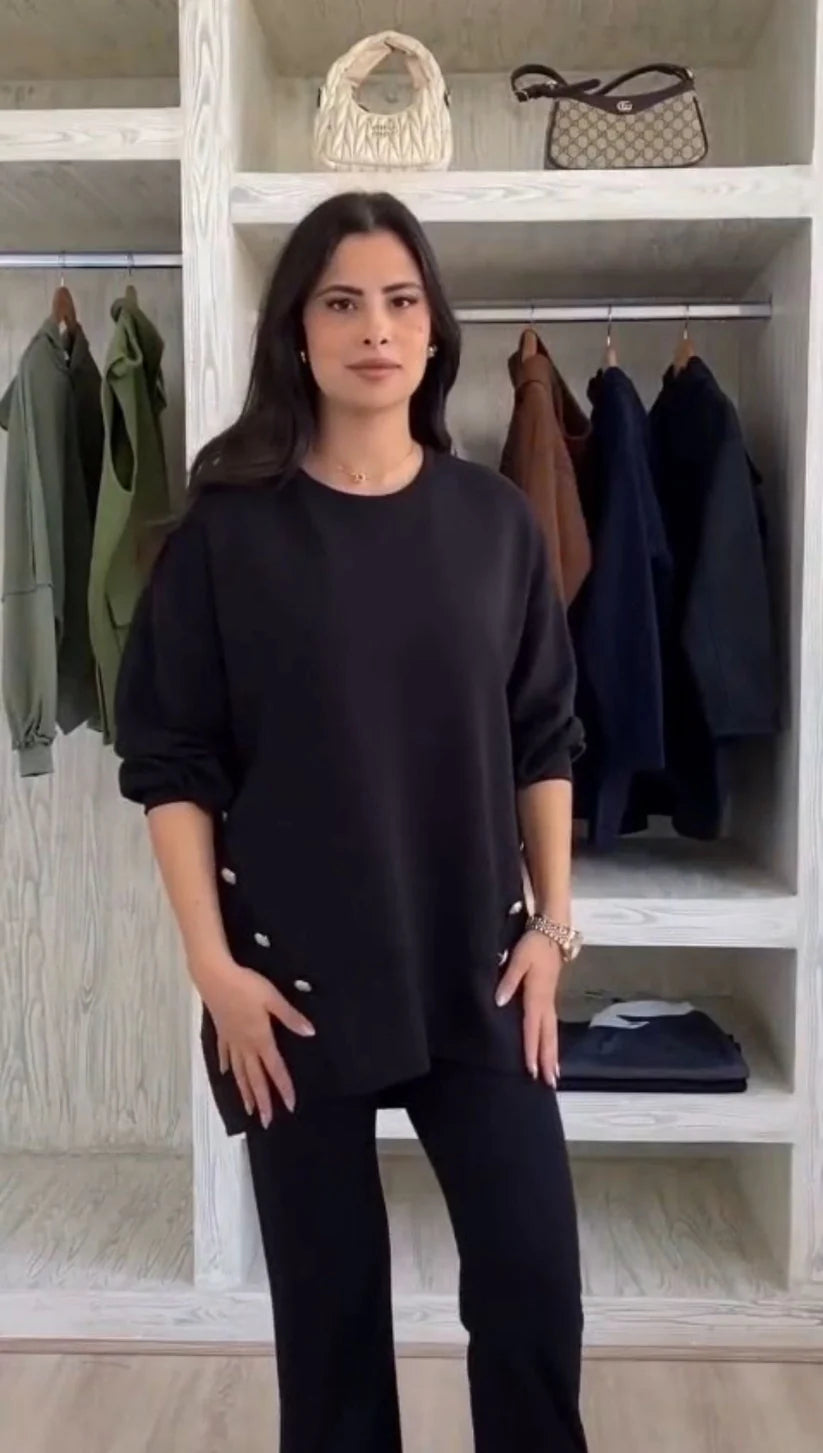 Kialakítás: Bő szárú nadrág (105 cm) és elöl rövidebb, hátul hosszabb (aszimmetrikus) fazonú felső (85 cm)