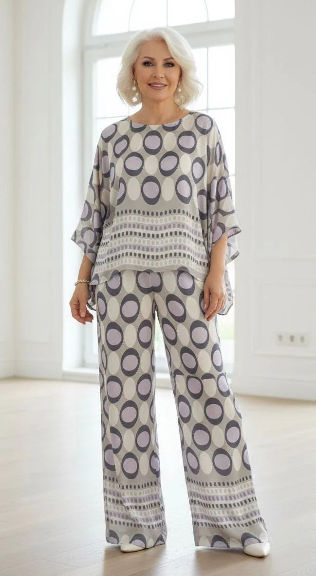 Stílus és kényelem: A bővebb fazonú blúz és a lezser nadrág ápol és eltakar, miközben nőies megjelenést biztosít.